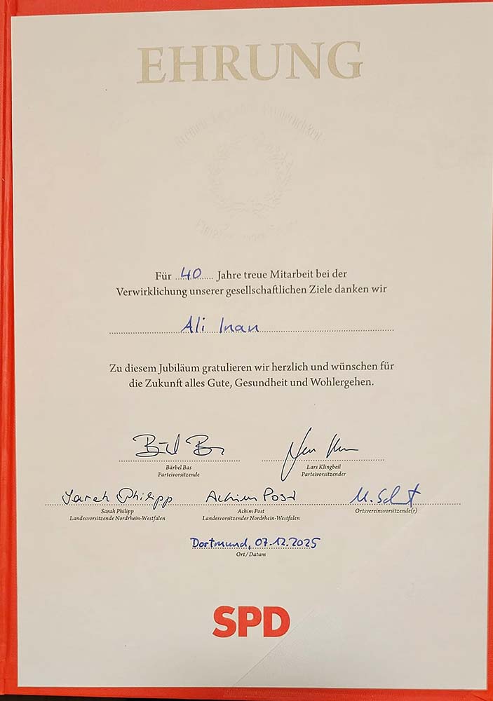 Ali İnan, bu plaketi üyeliğinin 40. Yılı münasebetiyle aldı. 1985 yılında SPD Dortmund-Eving teşkilatına üyelik kaydını yaptıran İnan, daha önce Eving ilçe teşkilatında yönetim kurulu üyeliği ve başkan yardımcılığı görevinde bulunmuştu.